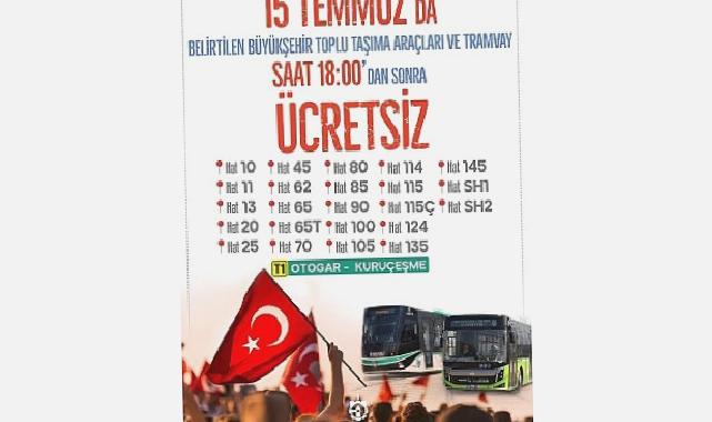 Kocaeli Büyükşehir Belediyesi, 15 Temmuz Demokrasi ve Ulusal Birlik Günü’nde saat 18.00 itibariyle kendi bünyesine ilişkin aşikâr otobüs sınır ve tramvaylarda gece 01.00’a kadar fiyatsız ulaşım hizmeti verecek.
